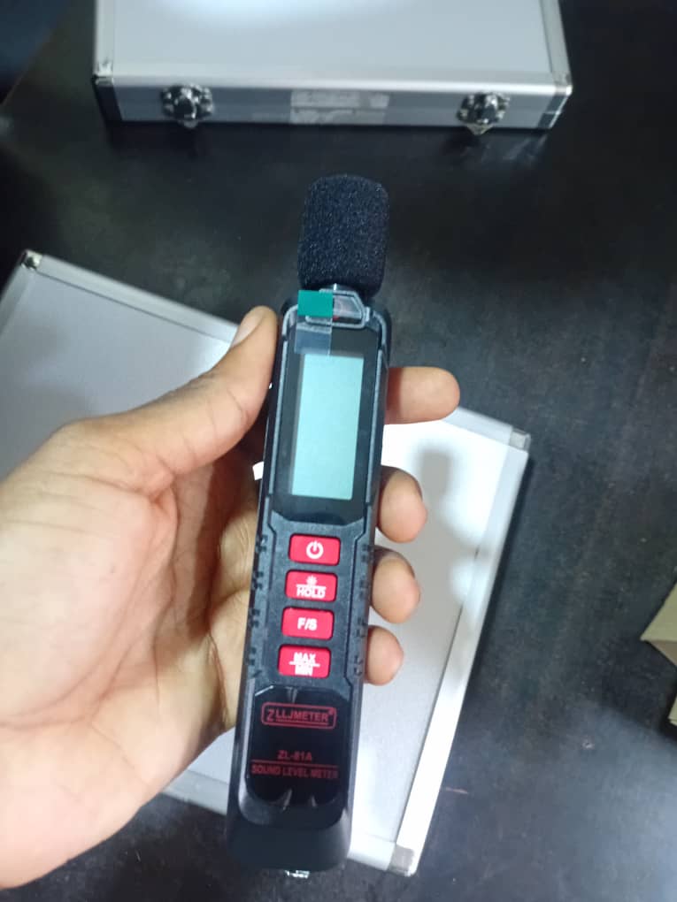 In StockA sound level meter (SLM) is a handheld, portable instrument designed to measure sound pressure levels (SPL) in decibels ( ). It captures, evaluates, and displays noise levels, commonly used for occupational health, environmental noise assessment, and acoustic analysis. SLMs consist of a microphone for detecting air pressure variations, electronic circuitry for processing signals, and a display screen.